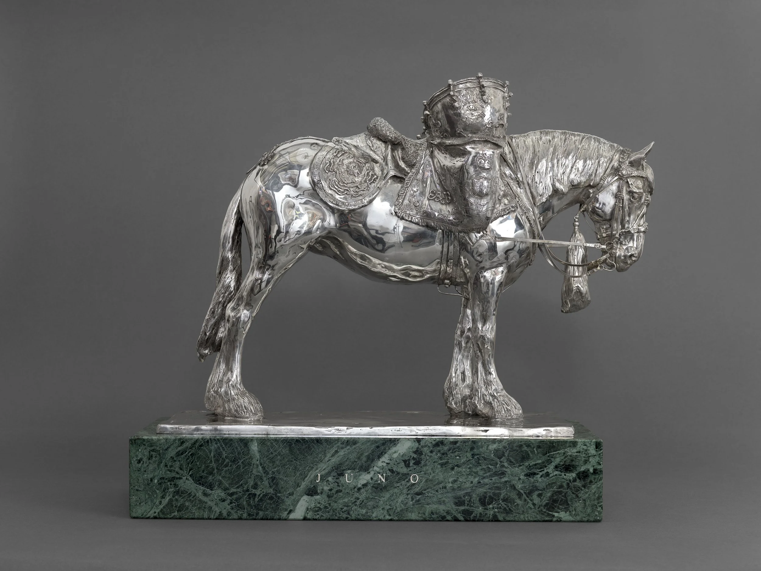 Silver Juno is unveiled! One special mare, one special silver. I am delighted to unveil my first sculpture cast in silver: the iconic drum horse Juno, complete with her silver drums and ceremonial state kit.